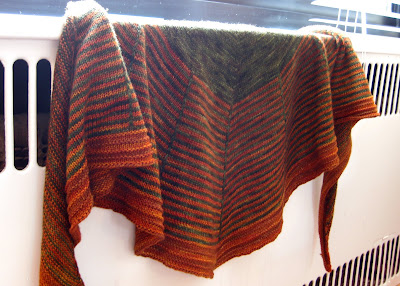 I was wrangling two and sometimes three balls of yarn, because I had two colors of orange that were slightly different and I decided to work them kind of like a gradient. Then at the end I was running out of one of the oranges so I did stripes of the two oranges together. It worked relatively well. I like the brighter orange better, though -- "Smaller Yellow Ant," if you are looking for a really gorgeous, rich, slightly brighter than pumpkin color. Fabulous. The other color is "Ruddy Daggerwing," which looked much darker and redder online, and is in fact only slightly darker and browner than the other orange (still a lovely color, but not as rich and bright). I had originally planned to stripe the two oranges, but they weren't different enough in color, so I ordered some more contrast yarn. The green is "Juniper Hairstreak." Again, a gorgeous color with a lot of depth. I had heard a lot about Sanguine Gryphon colors, and it was all true -- such beautiful, rich, sophisticated colors, with a nice variety of tones, but no pooling -- a truly gorgeous yarn. Bugga! is really soft but seems relatively strong. It did lose a little of its elasticity in blocking. This was fine for the shawl, though if I were to do it again I'd use smaller needles (I knit this on size 4). For the beret, it meant that I had to thread some elastic through the ribbing band. No big deal. Anyway, Bugga! is by far my favorite fingering/sock/light sport yarn now. So far it's wearing quite well, though of course it's a scarf, not socks. I don't think I'd use it for socks -- too soft, maybe not elastic enough, probably would wear out quite quickly. It's a tad on the pricey side, but the yardage is really generous. When I win the Megamillions, I am going to buy a skein of every color.
